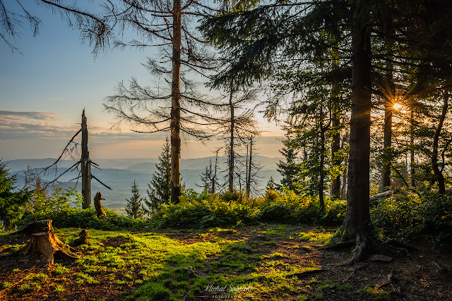 4.50 zostawiamy samochody na parkingu w Wyrębiskach Zalesiańskich. Paweł zabiera córkę - Wiktorię. Idą z nami też Dorota która jest uczestniczką moim plenerów oraz Marek. Po godzinie marszu, docieramy na wieżę widokową na Mogielicy. I tu znów bardzo miła niespodzianka bo spotykam Kubę - także uczestnika moich plenerów. Dotarł tutaj z psem, chwilę wcześniej spotykając na polanie... niedźwiedzia!